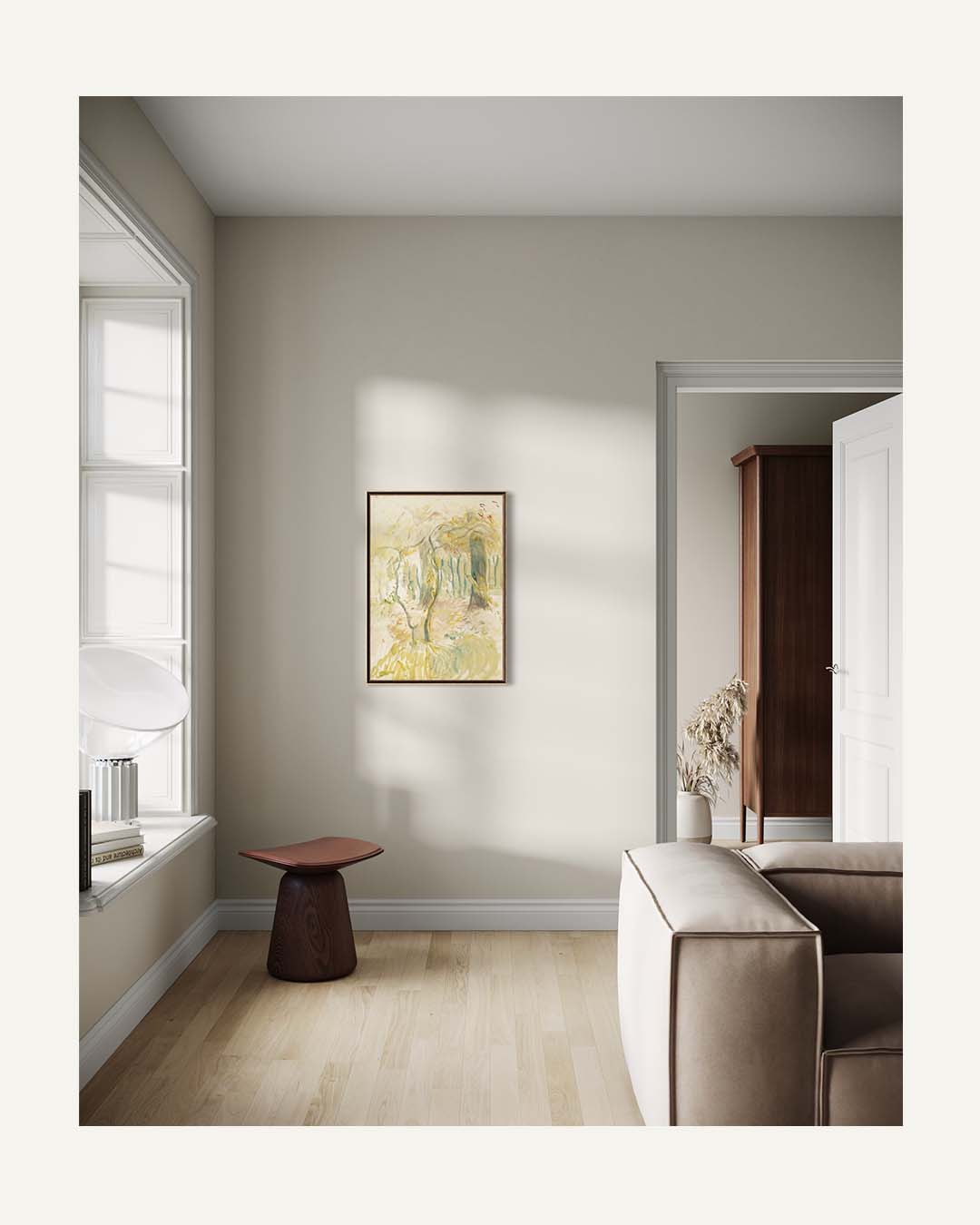 - Float Framed Canvas: Canvases are printed using a large format giclée printer, then professionally stretched and inserted into a float frame with approximately 1/4" reveal between the canvas edge and frame. Canvases are "glass-free." Float frames are offered in a natural solid wood frame and have a frame depth of approximately 2 3/16".