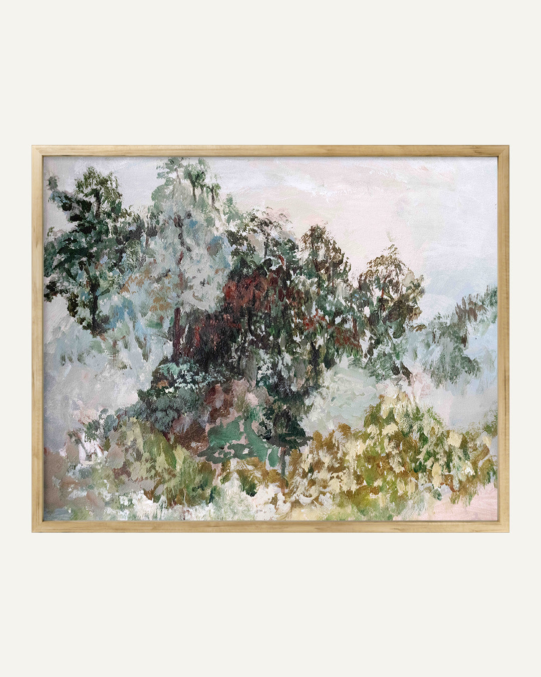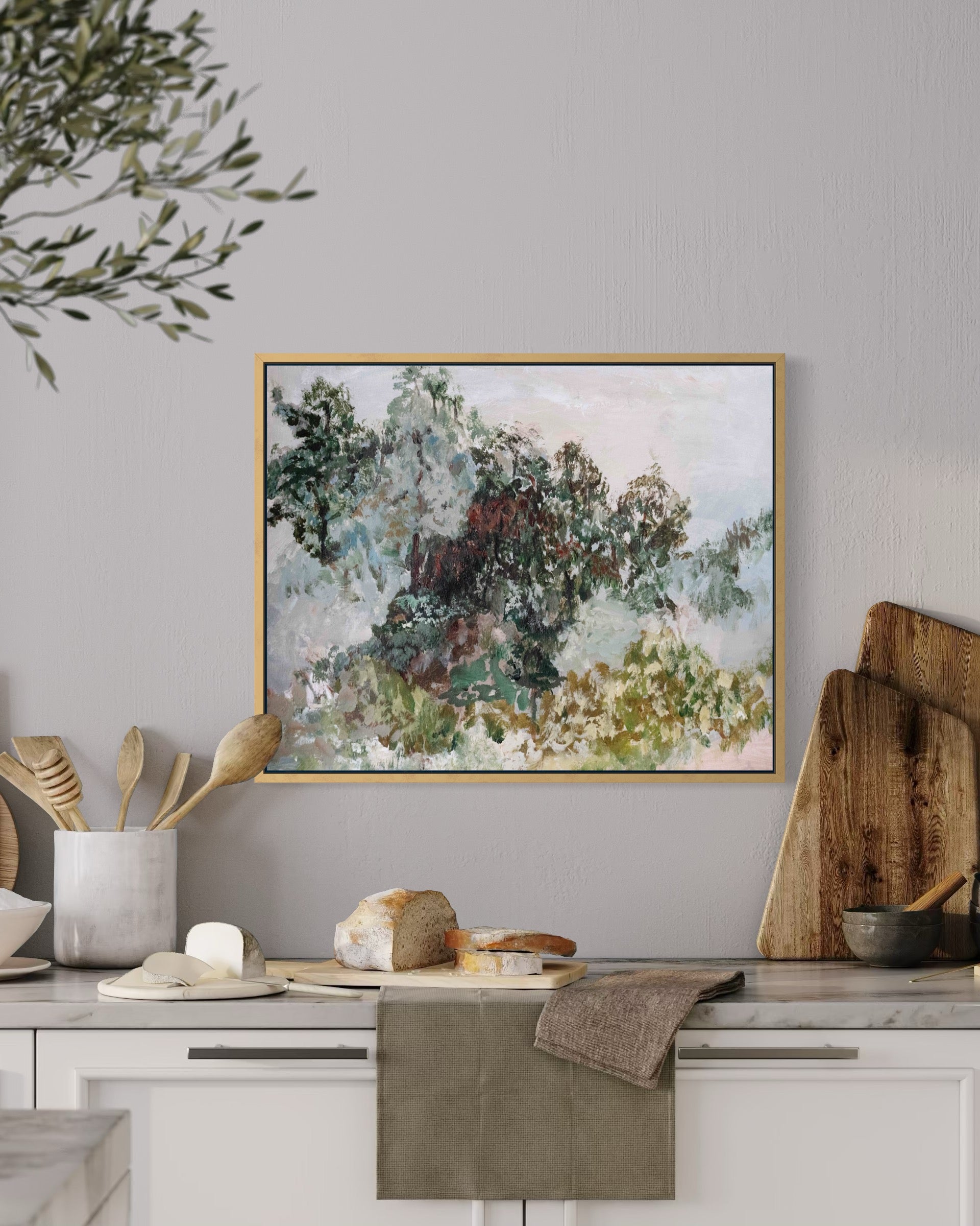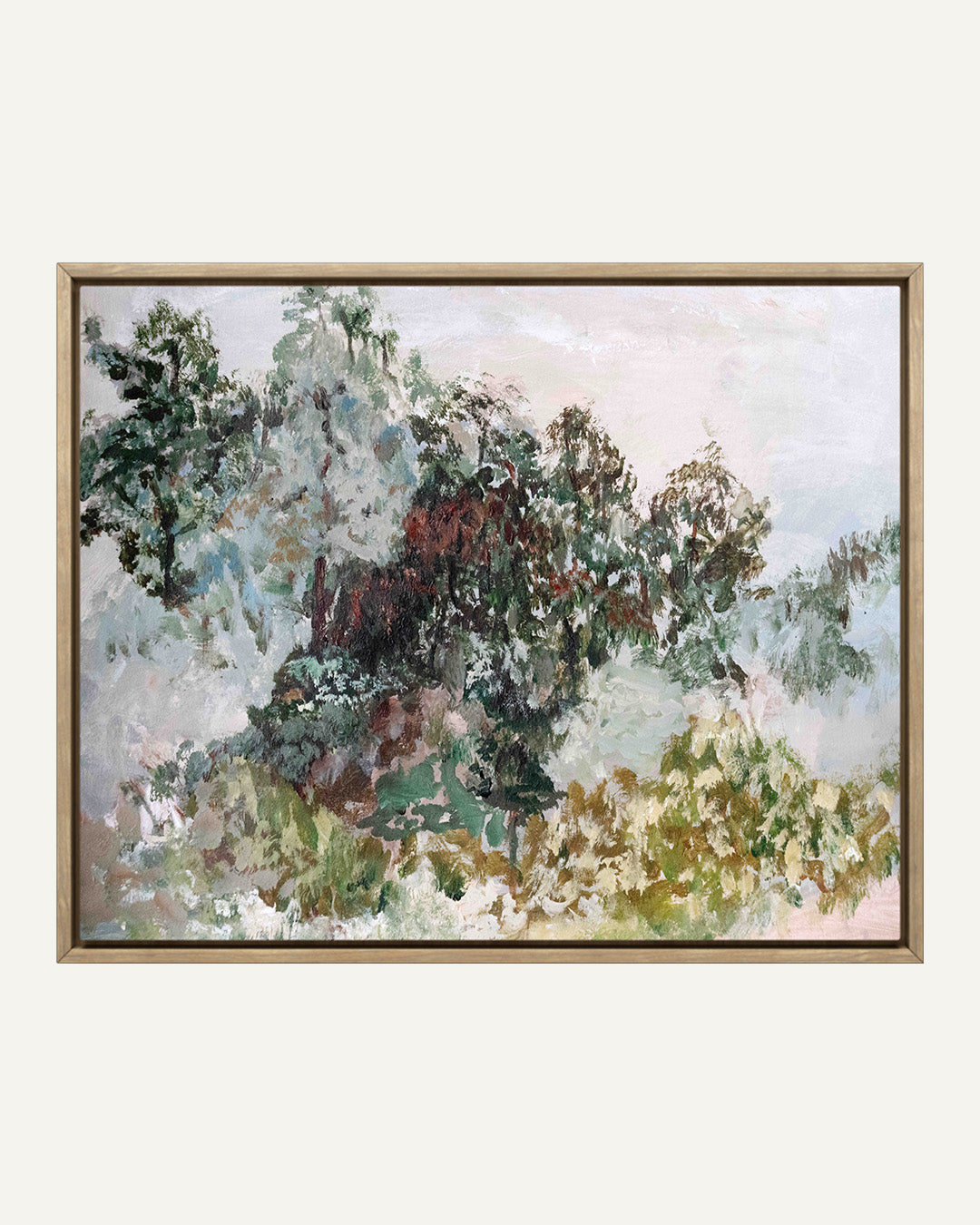 - Float Framed Canvas: Canvases are printed using a large format giclée printer, then professionally stretched and inserted into a float frame with approximately 1/4" reveal between the canvas edge and frame. Canvases are "glass-free." Float frames are offered in a natural solid wood frame and have a frame depth of approximately 2 3/16".