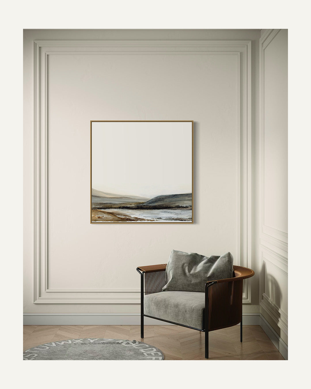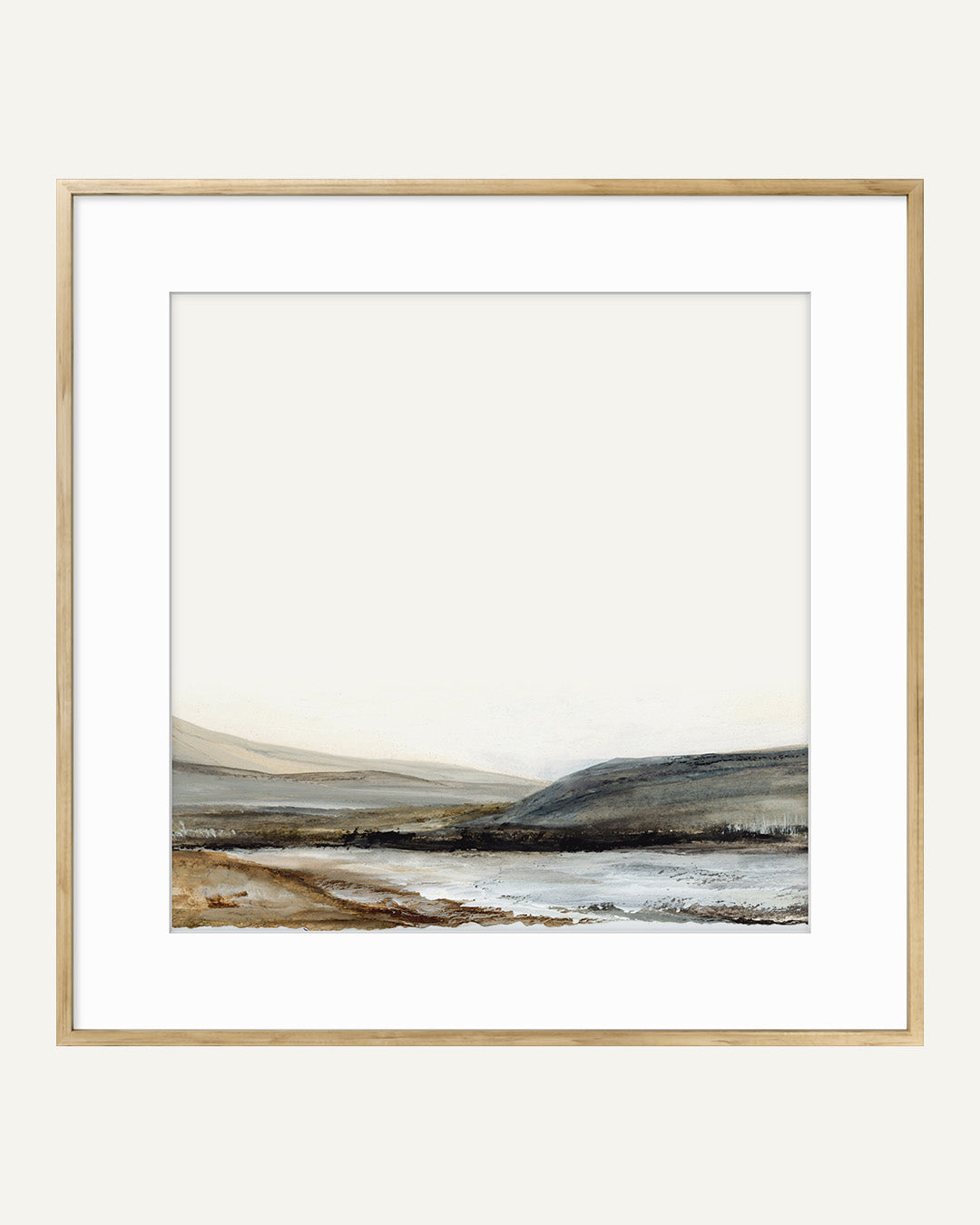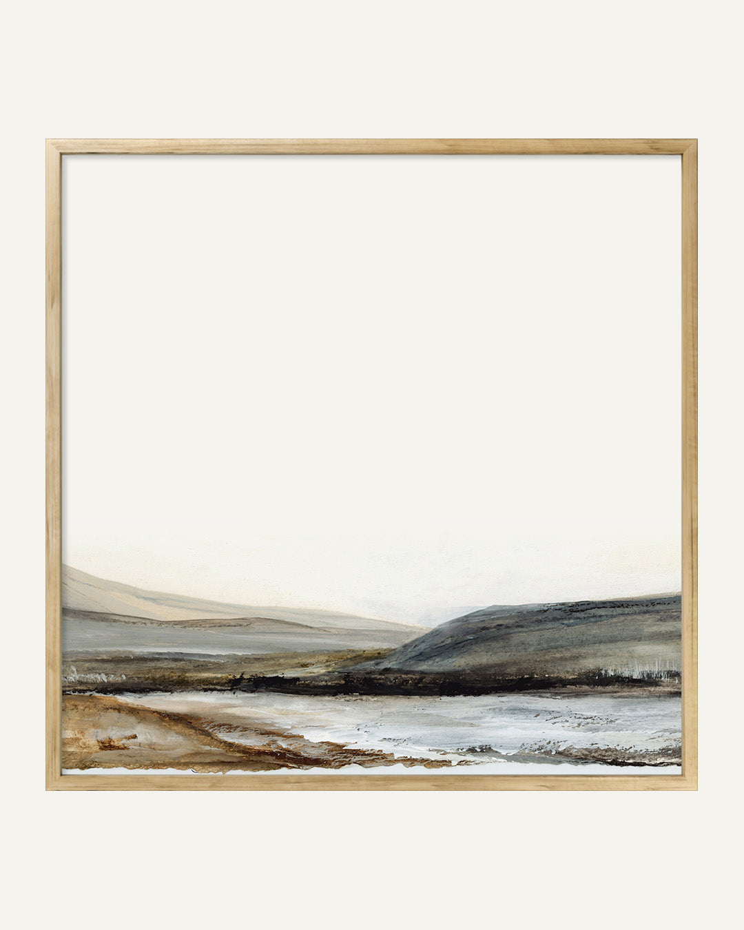 Inspired by trips to Colorado to see my sister, Riggs is a mountain landscape with a lively river, sandy beach, and rolling hills in the distance. May this piece bing peace and the need for adventure.