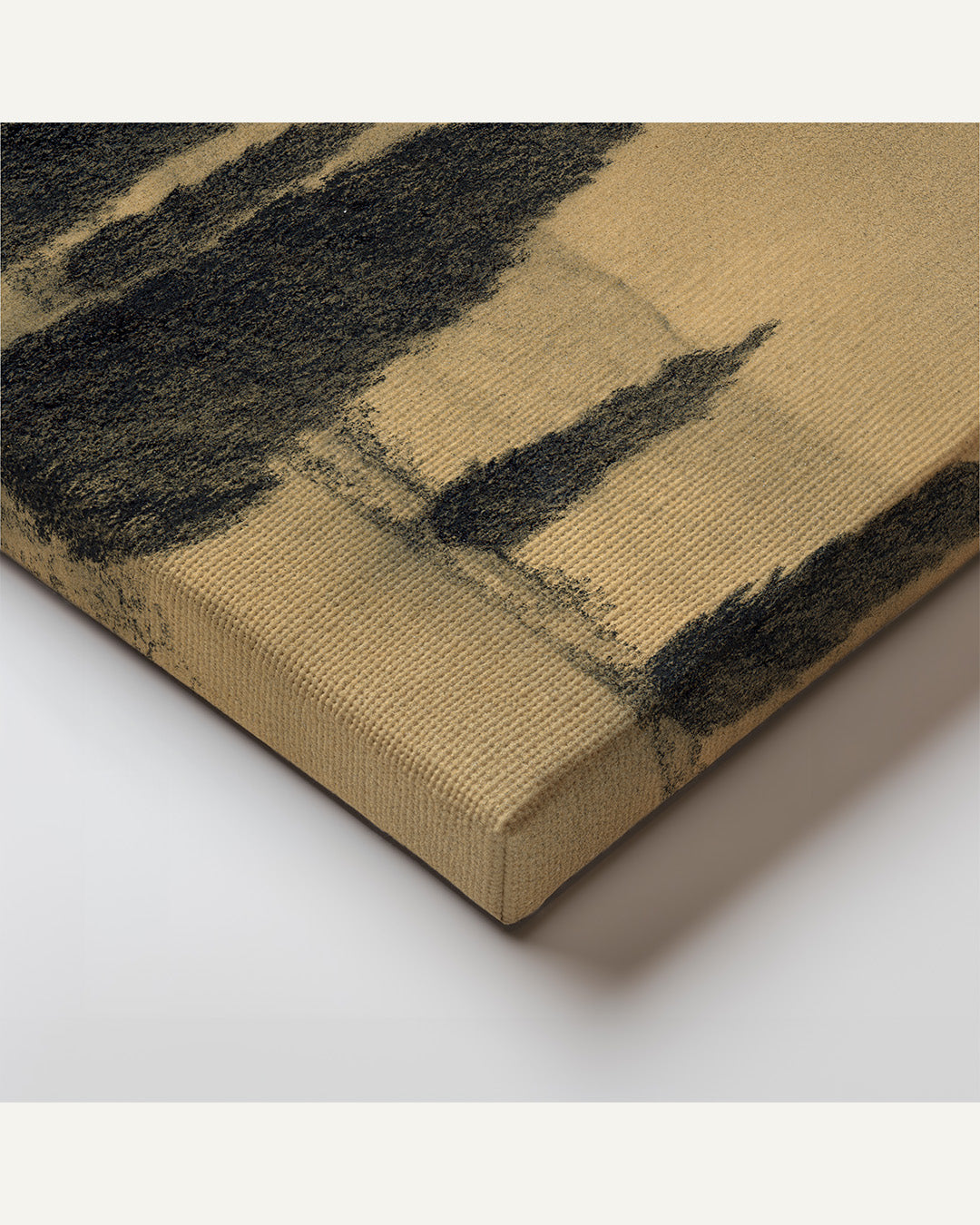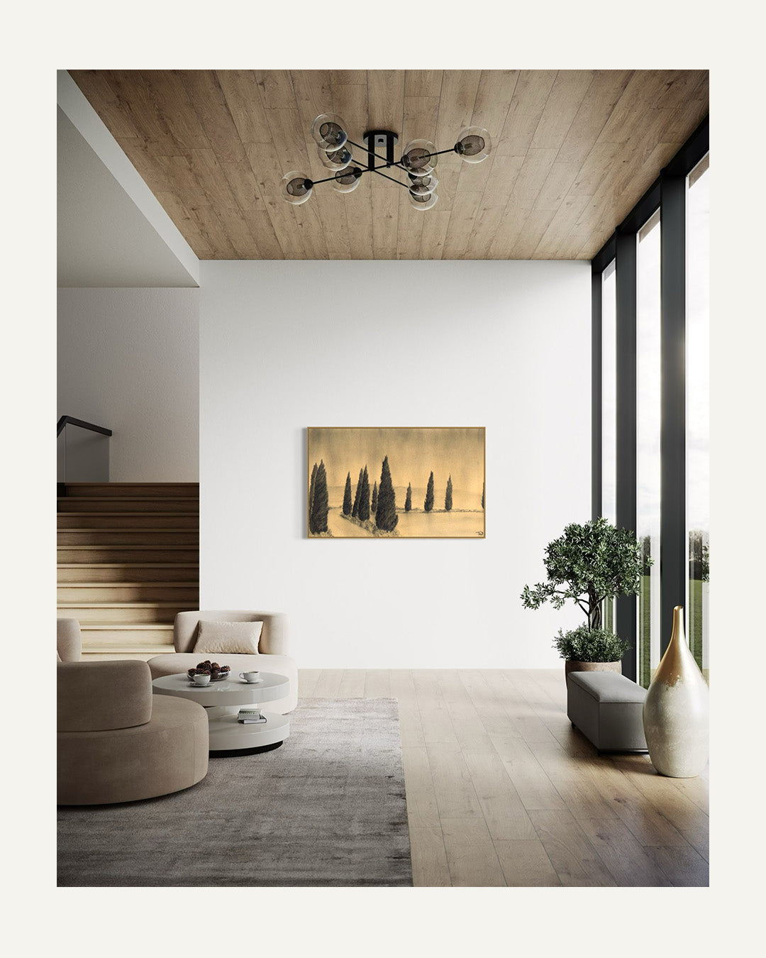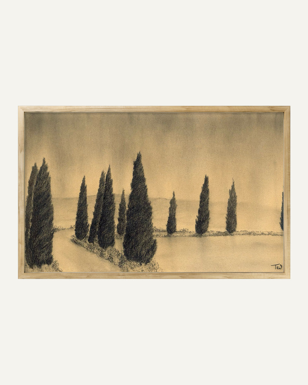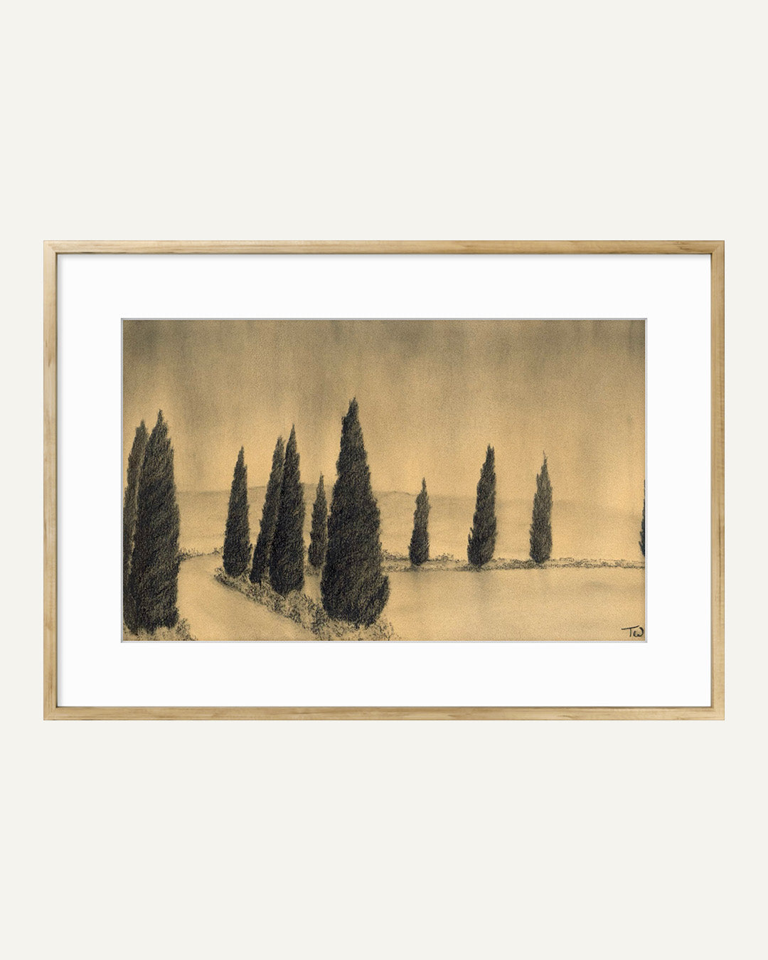 The original piece was done using various techniques of charcoal on vintage paper to create a soft, almost rainy feel. I have a deep connection to Italy, and this piece was a reflection of that. Memories of cypress lined roads, and open spaces play beautifully with the tones of the vintage paper. There is such a soothing warmth to this piece and I hope it brings just that.