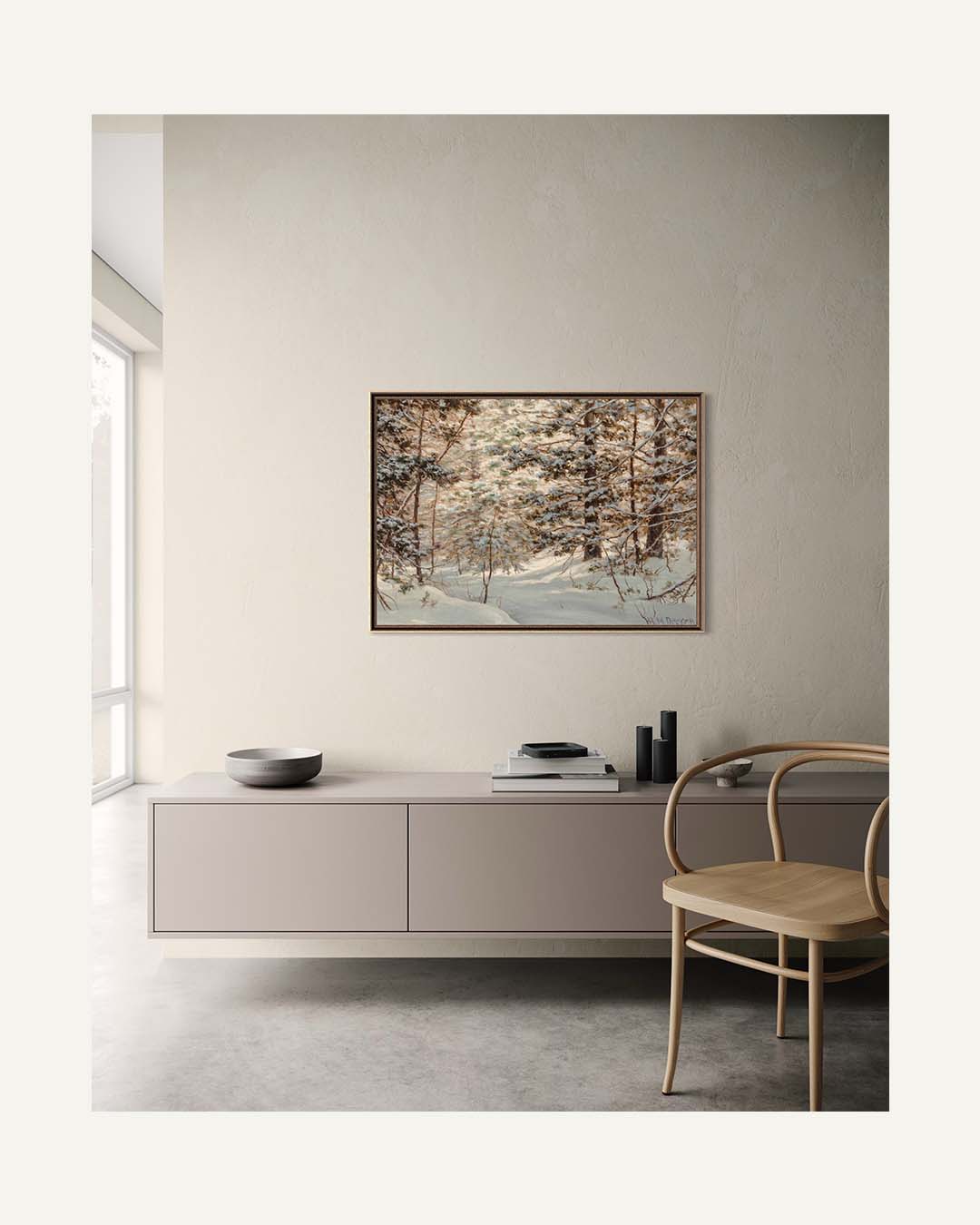 - Float Framed Canvas: Canvases are printed using a large format giclée printer, then professionally stretched and inserted into a float frame with approximately 1/4" reveal between the canvas edge and frame. Canvases are "glass-free." Float frames are offered in a natural solid wood frame and have a frame depth of approximately 2 3/16".