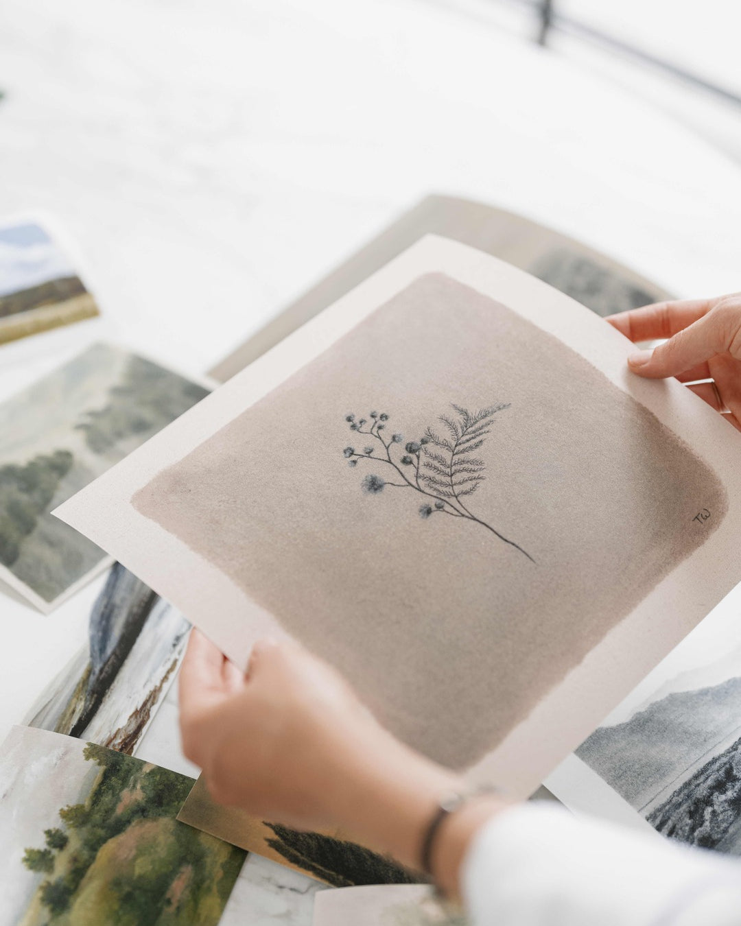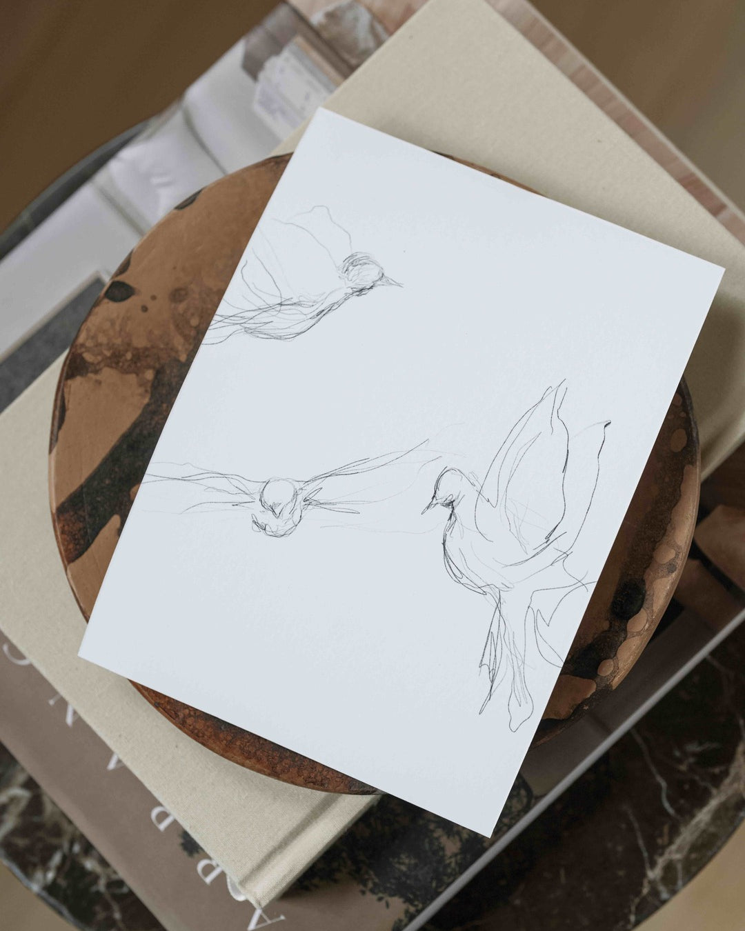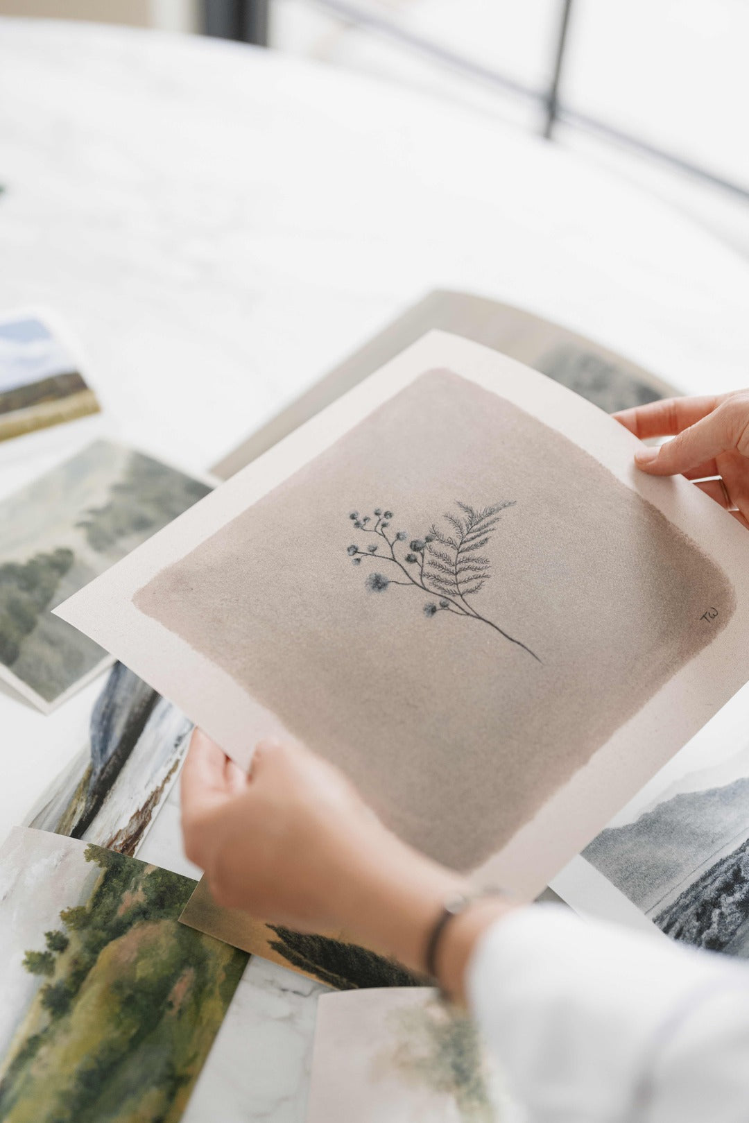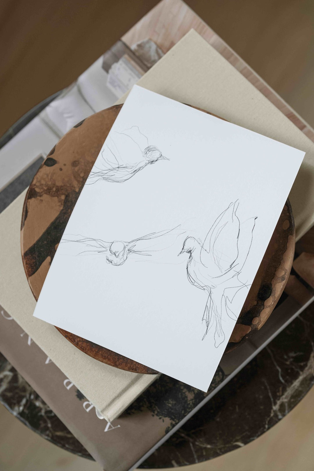 Drawings pair nicely with other artwork and other decor items such as vases, mirrors, and books. Display in entryways, on open shelving, or in bathrooms.